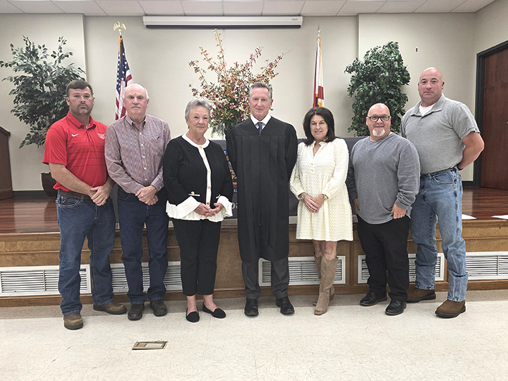 Probate Judge Mike Freeman administered the oath of office to Berry’s mayor and city council members on Monday, Nov. 3. Shown above, left to right, are Council Member Russell Madison, Council Member Calvin Madison, Mayor Mary S. Lollar, Probate Judge Mike Freeman, Council Member Nancy Shepherd, Council Member and Mayor Pro Tem Chris Lindsey and Council Member Chuck Tidwell. | Photo by Mickey Lollar