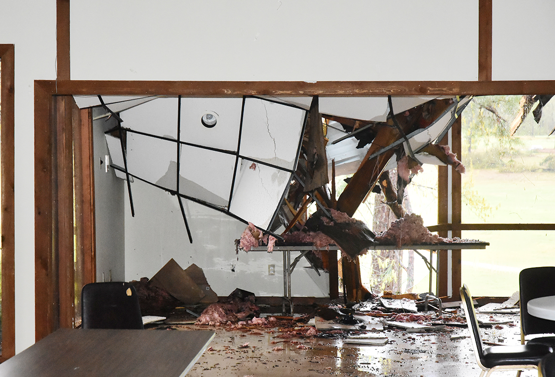Shown is a portion of the damage that occurred at the Fayette Country Club. Pictured is the damage caused by a tree falling into the main building. The roof on the bathrooms at the Country Club’s pool was also blown off and into the main building.